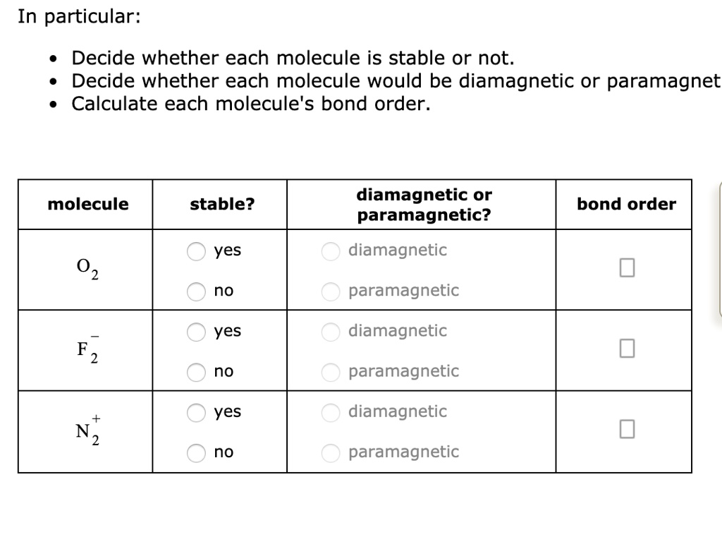 Solved In Particular Decide Whether Each Molecule Is Stable Or Not Decide Whether Each Molecule Would Be Diamagnetic Or Paramagnet Calculate Each Molecule S Bond Order Molecule Stable Diamagnetic Or Paramagnetic Bond Order